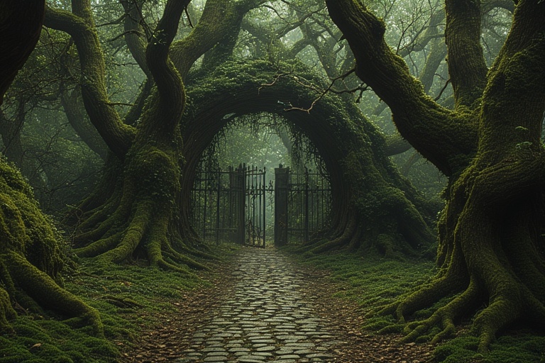 she pulls her broad sword and starts wacking her way thru the trail. this goes on for about 15-20 minutes when Bigor head butts her back. she turns towads him wiping sweat from her forehead, "what is it boy?" Bigor is not looking at her but over her shoulder. she turns to see what he is looking at. what she sees absolutely amazes her. further down the trail turns into a well laid out rock road leading up to a open gate. the trees lining this road appear to be ancient. one of the trees almost encircles the gate. there is moss covering the trees and grass lining the road, but not on the road or the gate thenselves. in fact, the road and gate are so clean it is obvious that they are well maintained.