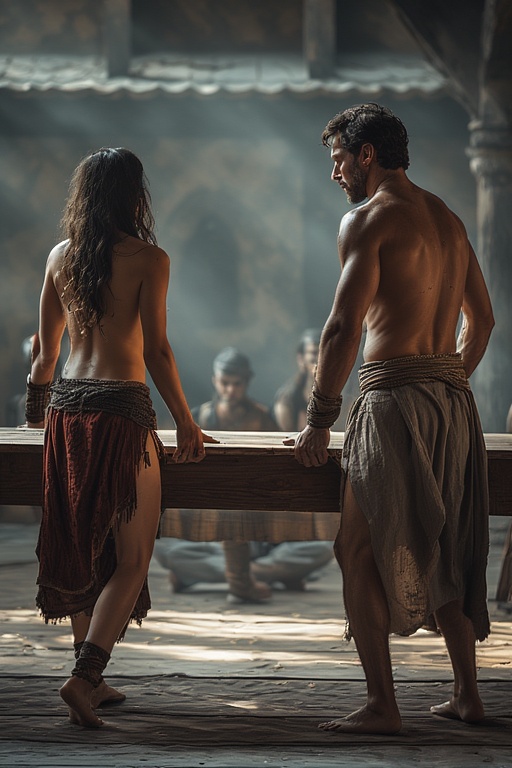 Eventually a man and a woman, naked except for a skimpy loincloth, struggle thru the door carrying a table between them. Mirian cannot see what is on the table. The Taurs all back away and give the two servants a wide berth, almost like they were scared of something on the table. The servants carry the table half way to the alter and put it down. The servants back away from the table with their heads bowed, returning to insde the manor. The servants make many trips back and forth from the manor to the table, bringing chairs (one at the head of the table, the rest down the right side of the table), bowls of food, pitchers of drinks, candles in ornate holders and many other items, some of which Mirian does not recoginize.